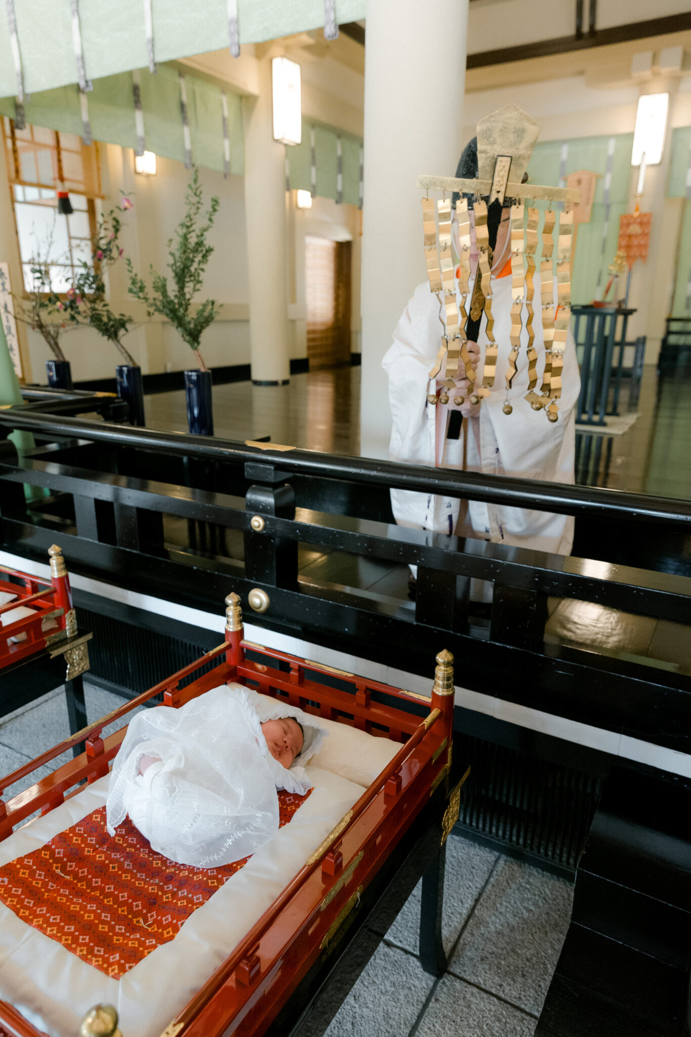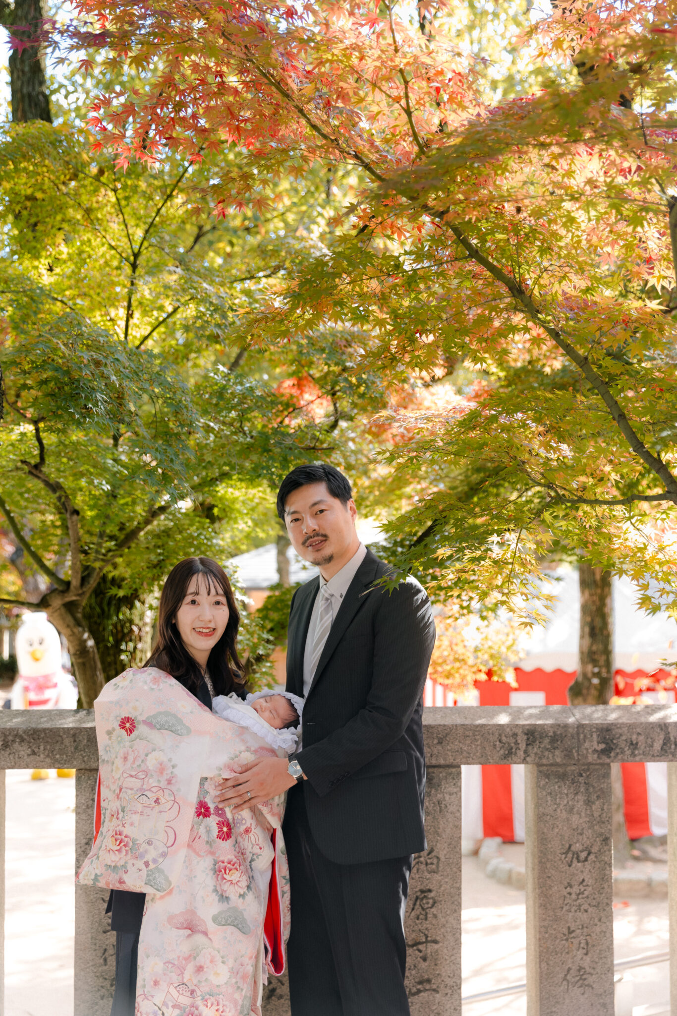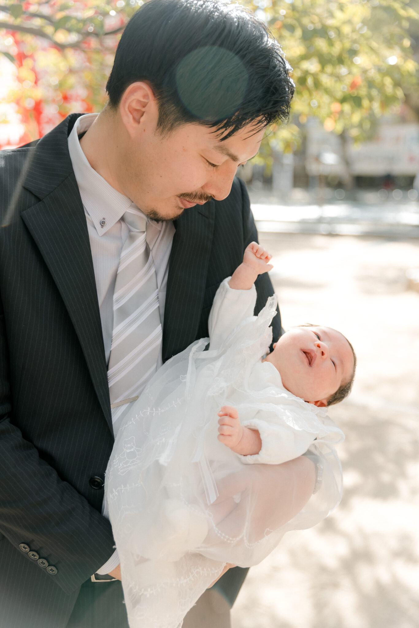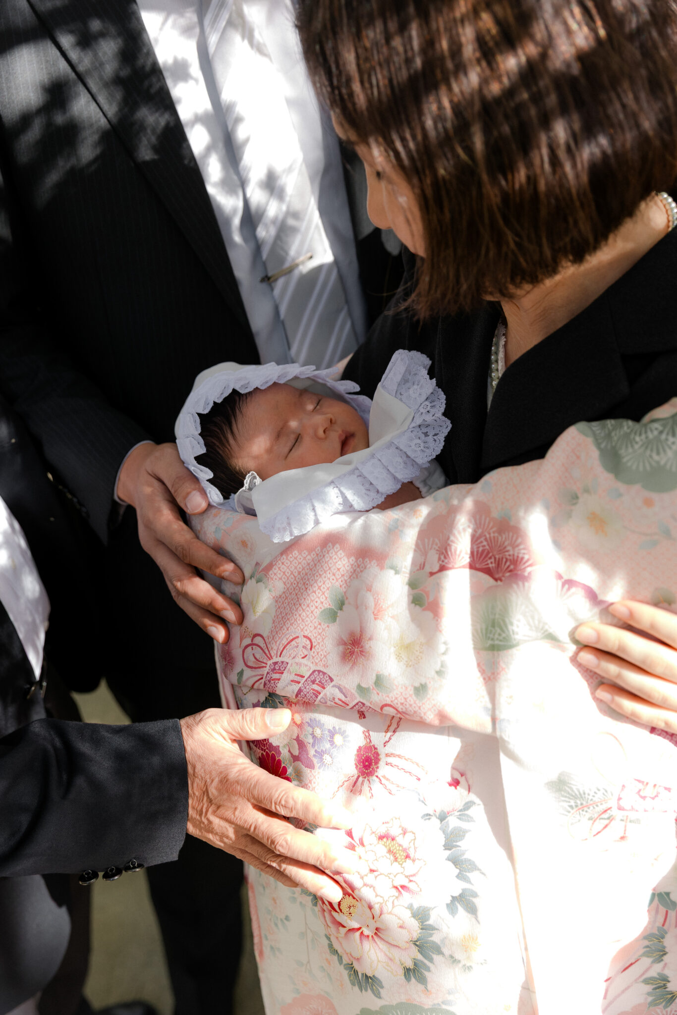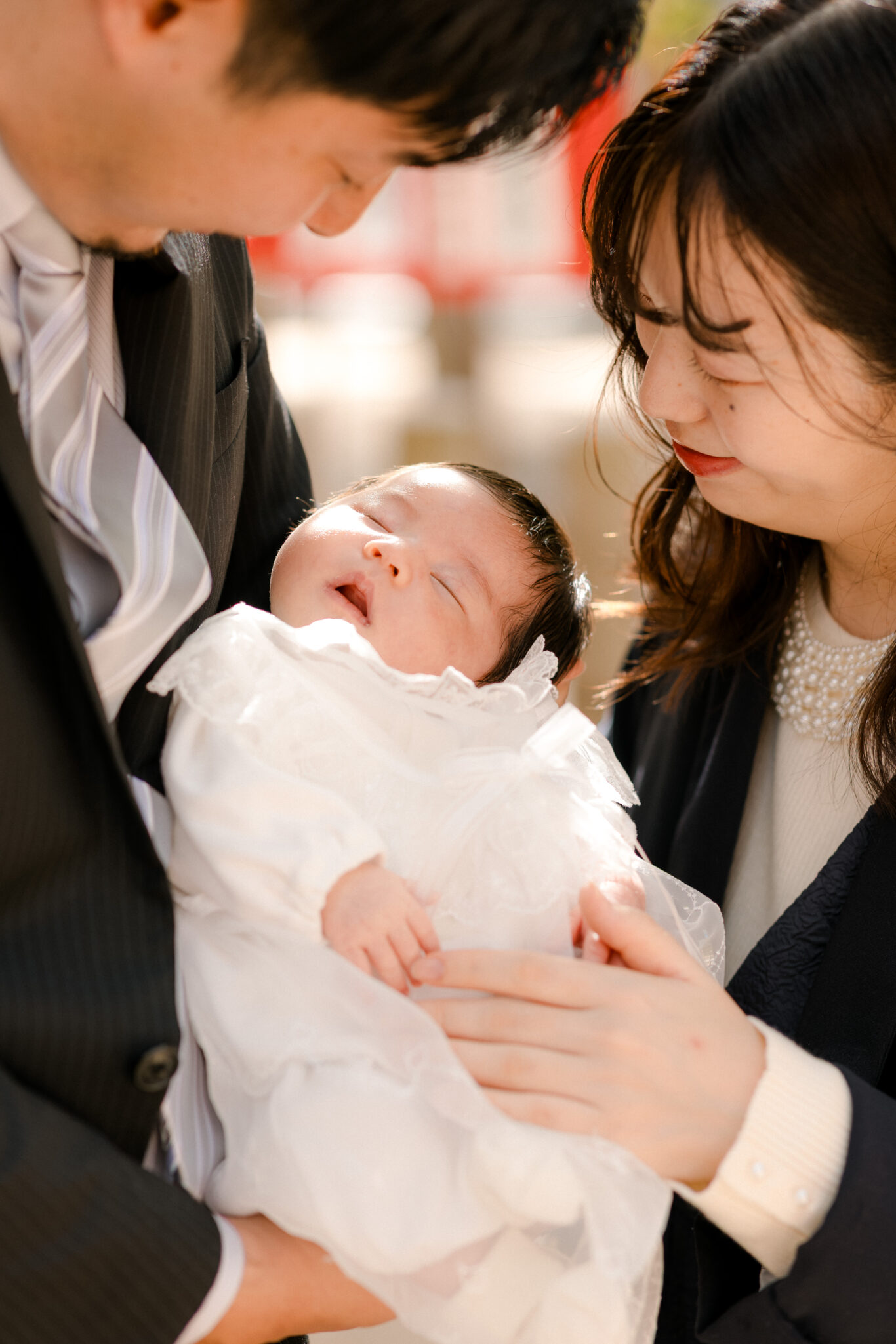 ぴかぴかに晴れた日に、つやつやの赤ちゃんのお宮参り。